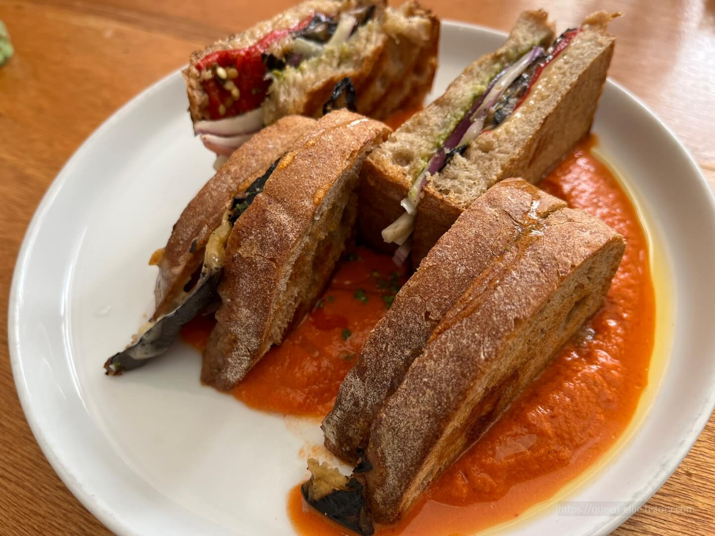 가지, 적양파, 피망, 하바티 치즈, 피망으로 만든 가스파초 소스